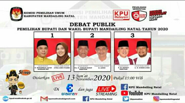 MANDALING NATAL-Debat kandidat calon Bupati/Wakil Bupati Kabupaten Mandailing Natal (Madina), akan digelar di Pandan, Kabupaten Tapanuli Tengah (Tapteng), Jum’at 13 November 2020.