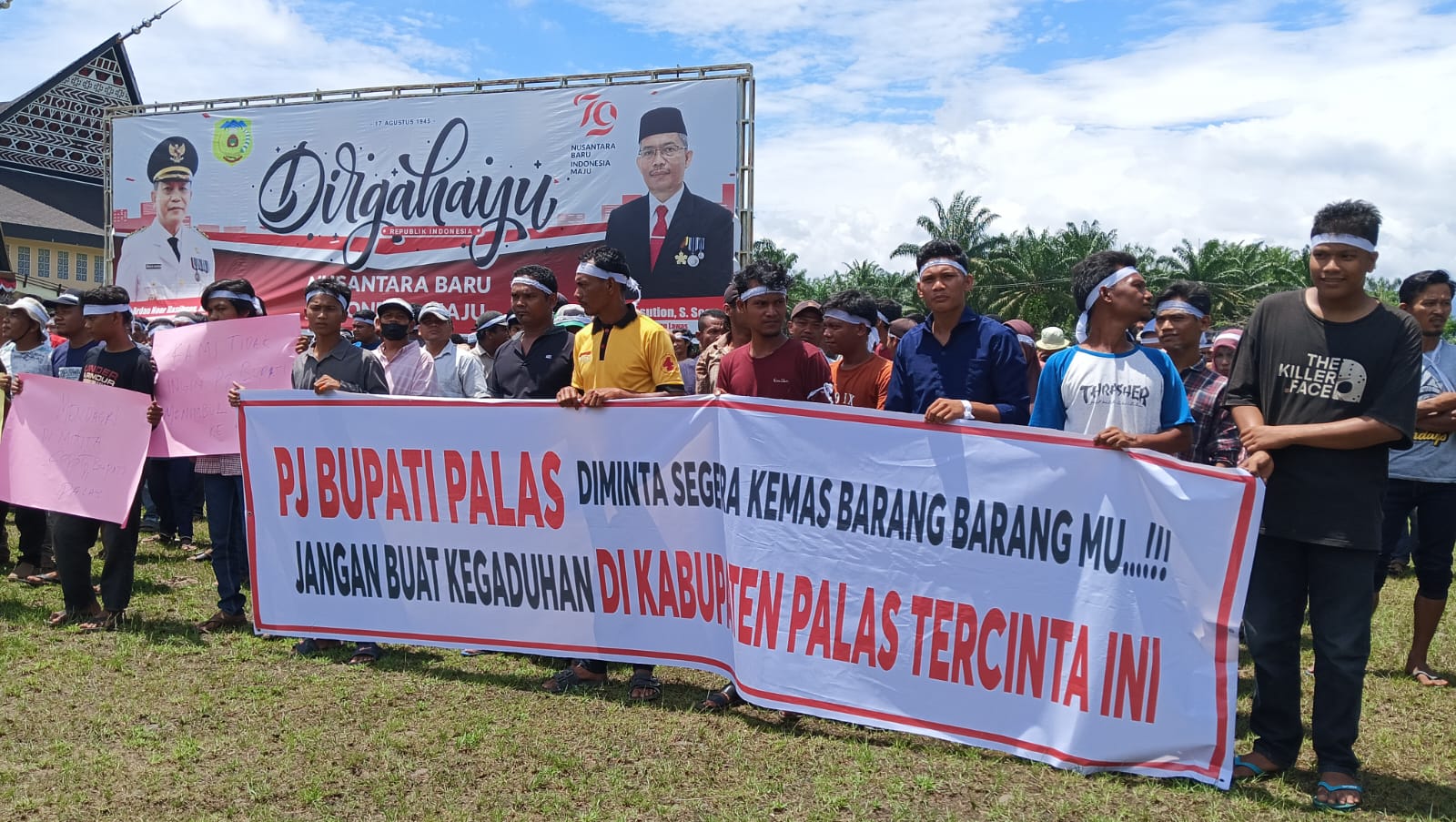 Dari pantauan di lapangan, sejumlah massa tampak membawa spanduk bertuliskan ” Pj Bupati Palas diminta segera kemas barang-barang mu, jangan buat kegaduhan di Kabupaten Padang Lawas”.