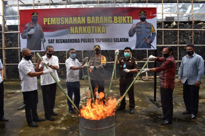 TAPANULI SELATAN-Polres Tapanuli Selatan (Tapsel) memusnahkan dan ganja 9 Kilogram lebih yang merupakan barang bukti hasil sitaan dari tersangka kasus narkotika, Kamis (8/10/2020) pagi di Jalan SM Raja, Kota Padangsidimpuan.