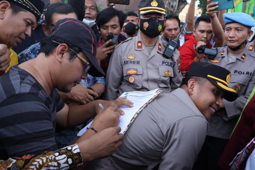 Namun dalam aksi tersebut, terlihat Kapolres Tapanuli Selatan, AKBP Imam Zamroni merelakan punggungnya untuk dijadikan landasan tempat tanda tangan.