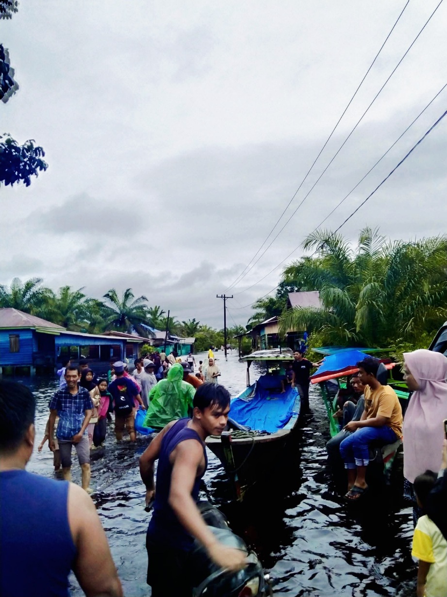 Sejumlah warga yang melintas dari badan jalan nasional di Singkuang terpaksa naik perahu. Sebab, ketinggian air mencai pinggang orang dewasa. Selain badan jalan nasional, air juga menggenangi pemukiman warga di Desa Transingkuang.