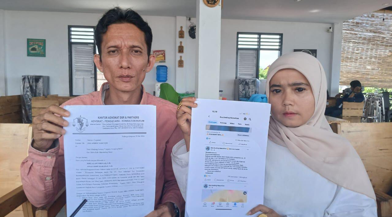 “Sehubungan dengan status akun FB @Era Andiny Nasution (23 Juni 2024 pukul 21.00 WIB), saya merasa keberatan dan tidak terima,” kata Elina Tasya Putri didampingi Kuasa Hukumnya, Dipo Alam Siregar, kepada wartawan di Kota Padangsidimpuan, Rabu (24/07/2024) siang.