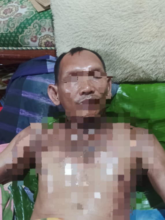 Dari foto tersebut terlihat tubuh oknum Sekdes itu mengalami luka bakar seperti di dada. Di bagian tersebut luka bakar masih terlihat gembung, sedangkan di pundaknya juga luka bakar masih terlihat gembung.