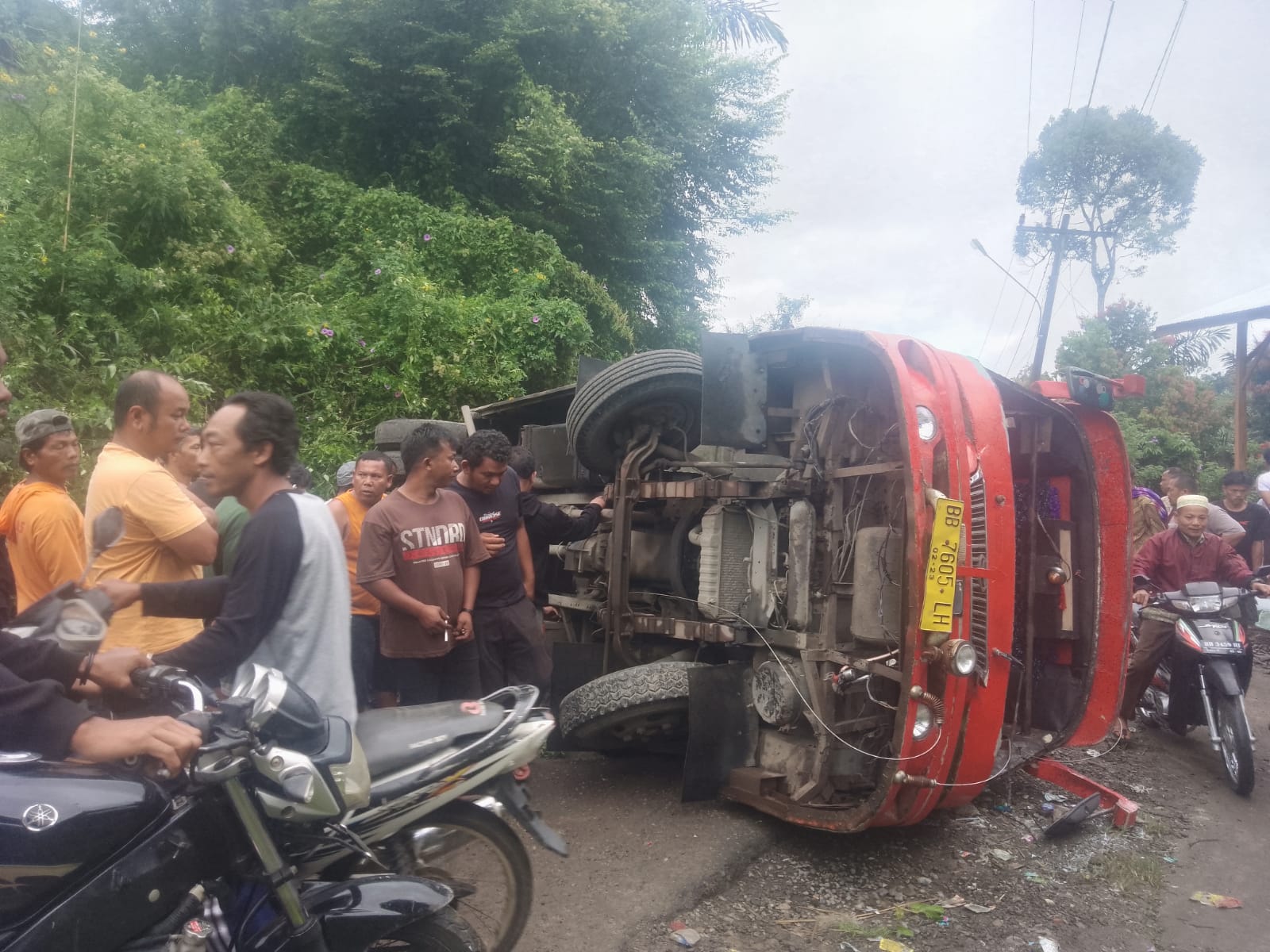 “Tiba-tiba, Bus tak sanggup menanjak. Serta, mundur ke arah tebing Jalan sebelah kanan menuju Sipirok. Lalu, Bus terbalik di tengah Badan Jalan,” ujarnya.