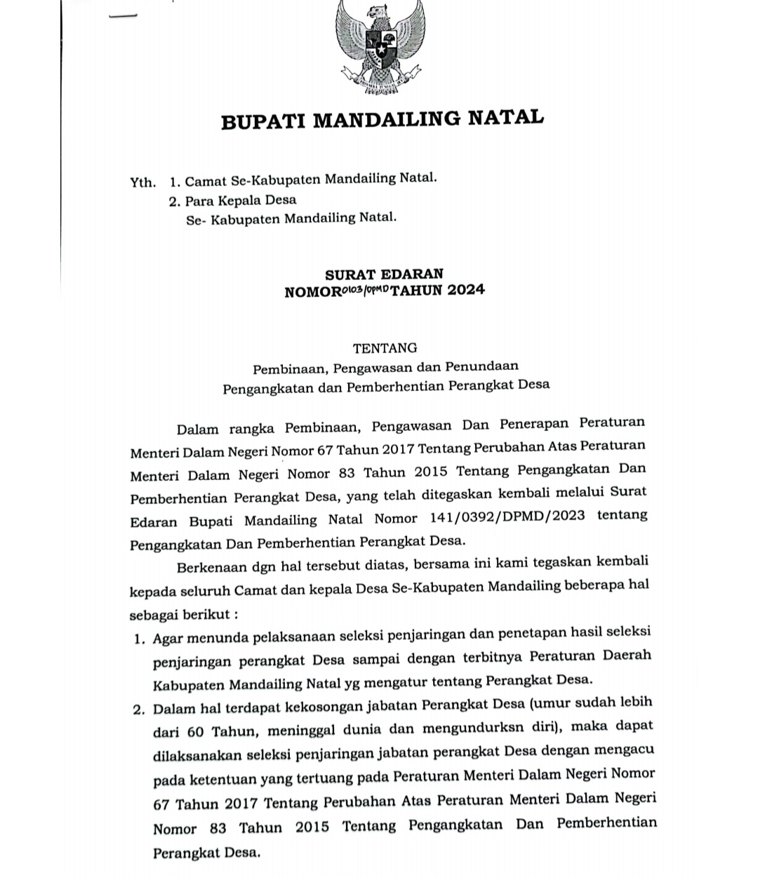 Surat edaran Bupati Madina tersebut dalam rangka pembinaan, pengawasan dan penerapan peraturan Menteri Negeri nomor 67 tahun 2017, tentang perubahan Permendagri nomor 83/2015 tentang, pengangkatan dan pemberhentian perangkat desa yang telah ditegaskan kembali melalui surat edaran Bupati Mandailing Natal.