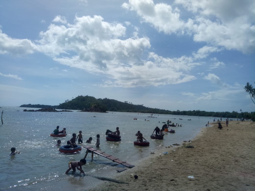 MANDAILING NATAL-Pantai Batu Ruso Indah di Desa Tabuyung, Kecamatan Muara Batang Gadis, Kabupaten Mandailing Natal, Sumut, jadi surga liburan lebaran untuk anak-anak.