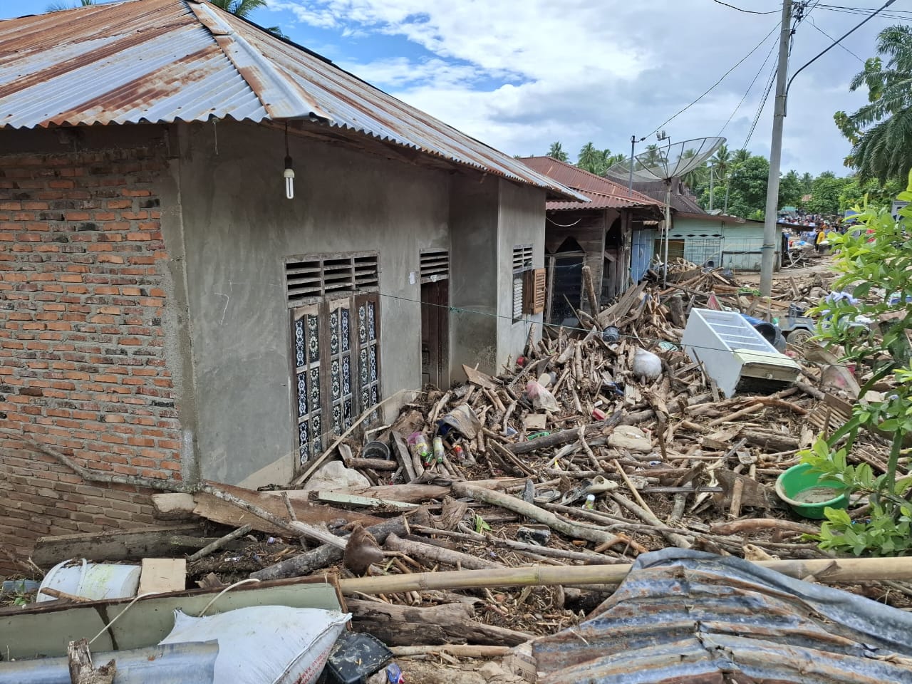 Selain itu, sejumlah rumah hingga fasilitas umum dipenuhi material kayu. Sedangkan, jalan di Desa tersebut masih tertimbun sisa material tanah dan gelondongan kayu.