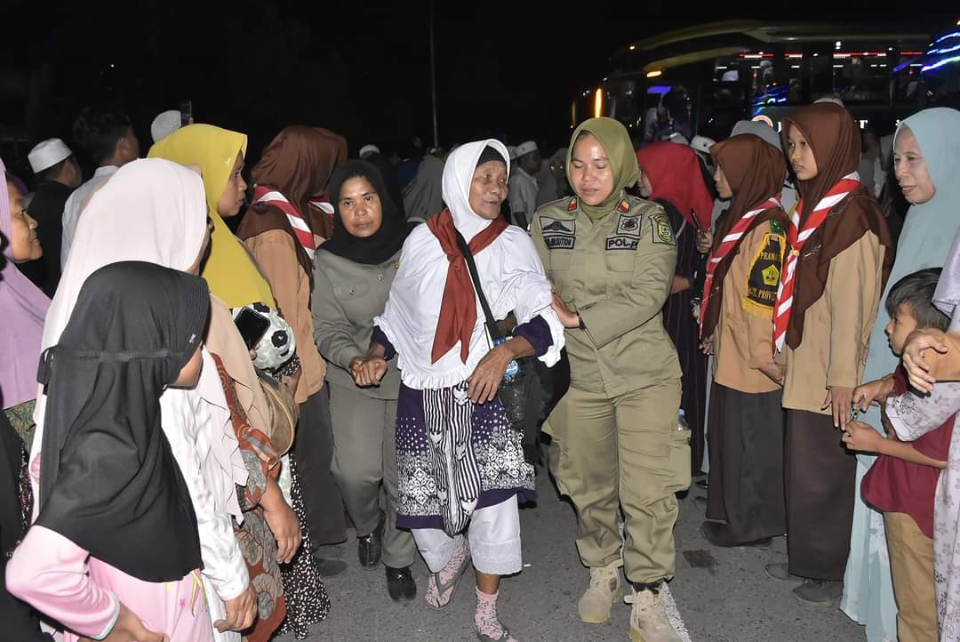 Sebanyak 357 Jemaah Haji asal Mandailing Natal yang tergabung dalam Kelompok Terbang 3 Tiba di Mesjid Agung Nur Alannur Sekitar pukul 20.50 Wib, Jadwal ini Mengalami Keterlambatan dari waktu yang direncanakan.
