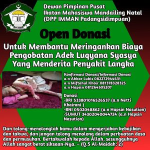 PADANGSISIMPUAN– Ringgankan biaya pengobatan terhadap Luqyana Syasya, balita berusia 4 tahun asal Desa Lancat, Kecamatan Lingga Bayu, Mandailing Natal, yang menderita penyakit kulit. Dewan Pimpinan Pusat (DPP) Ikatan Mahasiswa Mandailing Natal (IMMAN) Padangsidimpuan mengelar penggalangan dana.