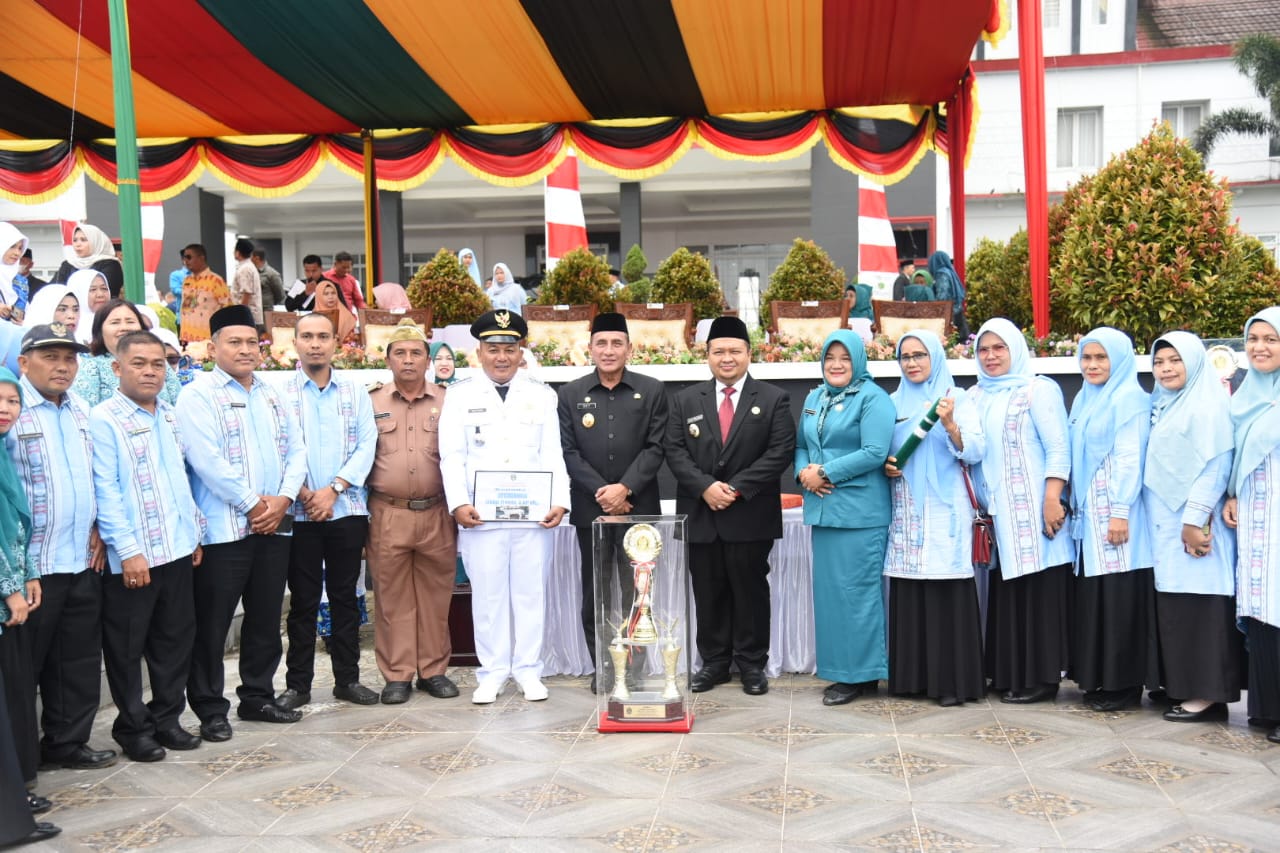 Gubernur Sumatera Utara Edy Rahmayadi menyerahkan Tunggul Kecamatan Terbaik I kepada Camat Batang Toru, Mara Tinggi Siregar di Lapangan Parade Perkantoran Pemerintah Tapanuli Selatan, Sipirok, Kamis (16/2).