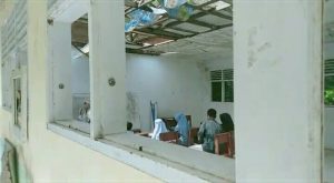 Dari jauh, terlihat para siswa sedang asik belajar di ruangan yang beratapkan langit dengan kondisi bangunan yang rusak parah. Salah seorang guru terlihat serius memberikan mata pelajaran kepada para siswa.