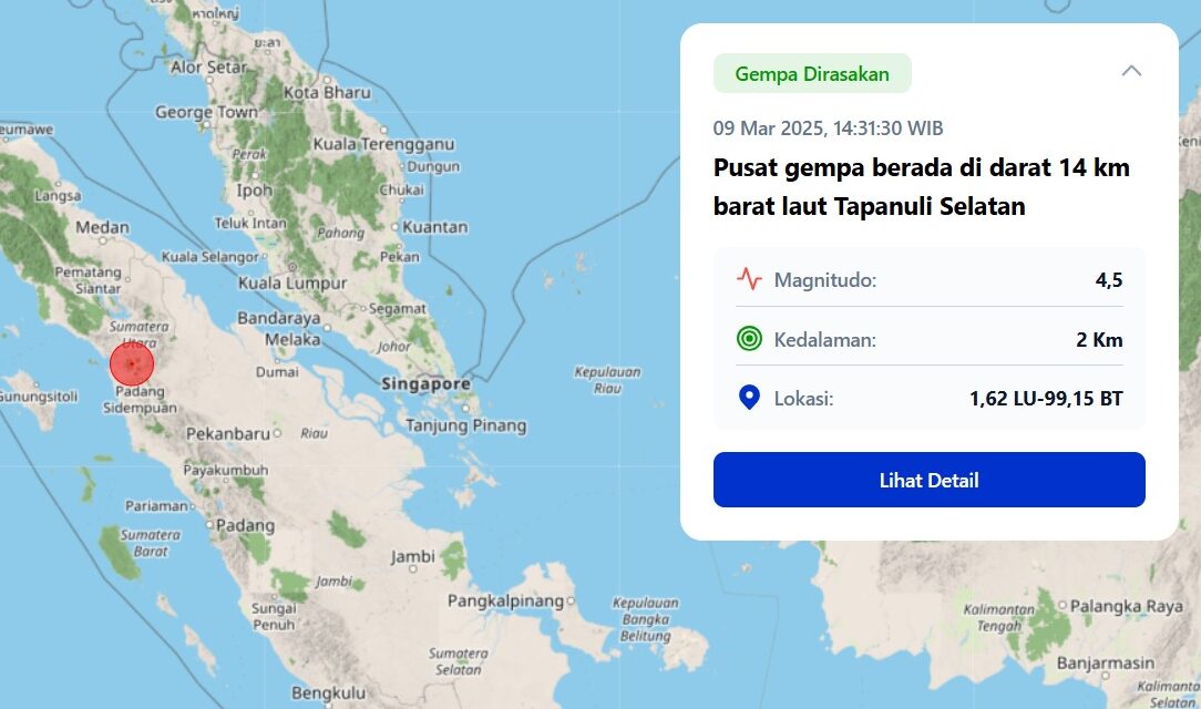 TAPANULI SELATAN (TAPSEL) – Tapanuli Selatan (Tapsel), Sumatera Utara, diguncang gempa dengan magnitudo 4,5 pada siang ini, Minggu (9/3/2025).