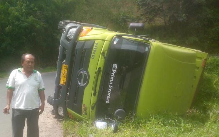 Kemudian, saat melewati tikungan dengan posisi menurun, tiba-tiba satu unit truk datang dari arah berlawanan dan terjadi crash sehingga pengemudi truk bernomor polisi BK 8029 FR dengan muatan air mineral itu terpaksa banting setir ke sisi kiri hingga terbalik.
