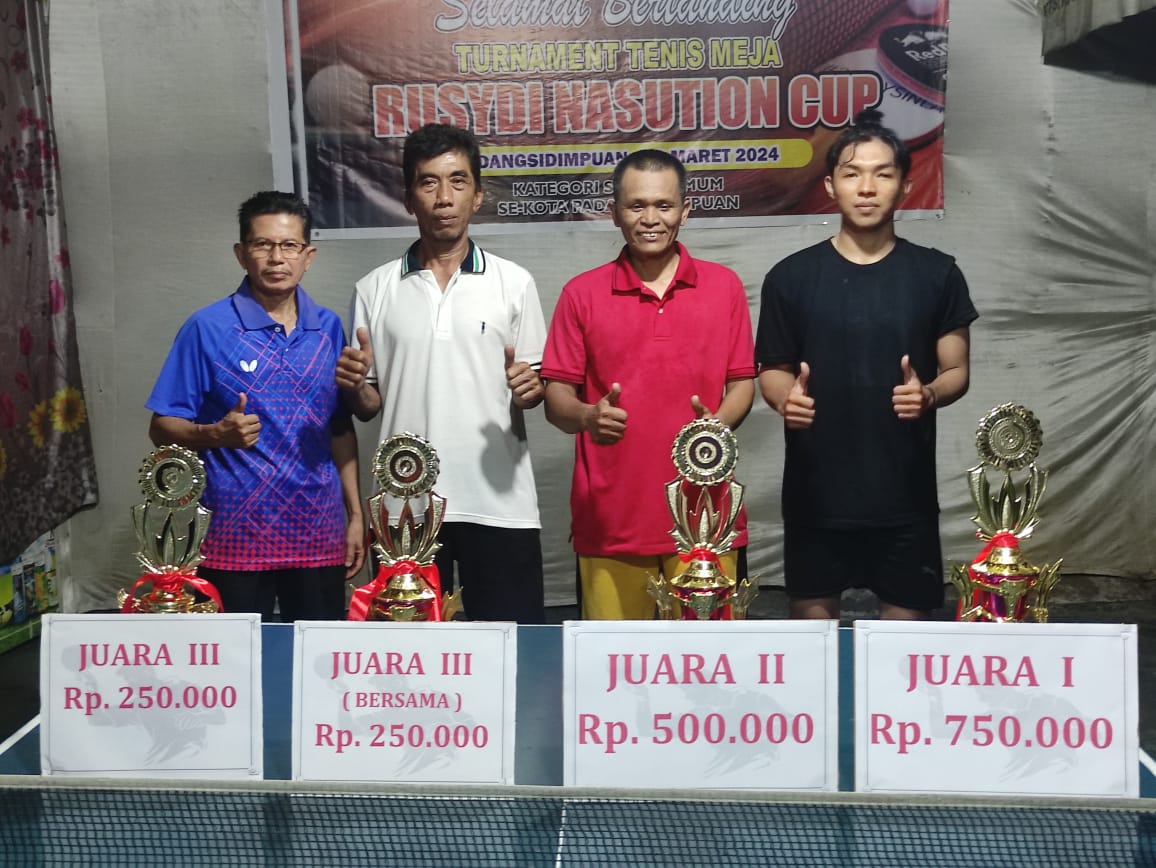 “Saya ucapkan selamat kepada para pemenang. Olahraga tenis meja ini harus kita galakkan terus menerus secara berkelanjutan. Selain membuat tubuh sehat, pikiran kita juga sehat. Tentunya juga ini upaya kita untuk memajukan olahraga di Sidimpuan,” kata Rusydi memberi sambutannya.