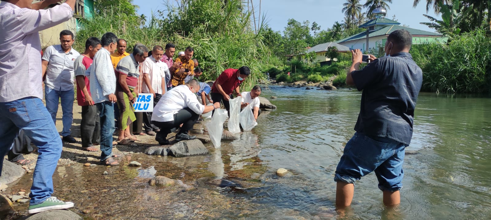 TAPANULI SELATAN-Bupati Kabupaten Tapanuli Selatan (Tapsel), Sumatera Utara (Sumut), Dolly P Pasaribu, melepas ribuan bibit ikan di Lubuk Larangan Batang Tura, Kecamatan Angkola Timur, Jumat (27/5/2022).