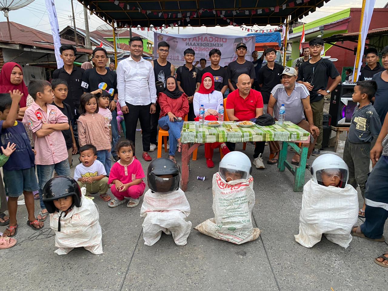Sejumlah anak-anak di bawah umur terlihat mengikuti lomba lari dalam karung. Uniknya, anak-anak itu juga dipakaikan helm.