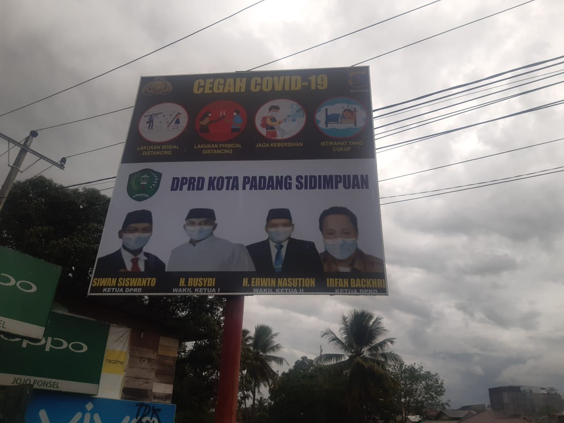 Dimana, baliho yang bertuliskan Cegah COVID-19 terpampang foto 4 pria, 3 diantaranya merupakan pimpinan DPRD Kota Padangsidimpuan yakni, Siwan Siswanto selaku Ketua, Rusydi selaku Wakil Ketua I, dan Erwin Nasution yang merupakan Wakil Ketua II.