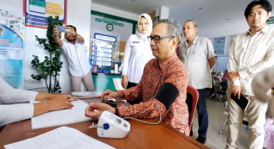 Selanjutnya, beliau juga terlihat berkomunikasi dengan para petugas medis yang ada di puskesmas itu. Bahkan, ia juga menyempatkan diri untuk memeriksa tensi darah.