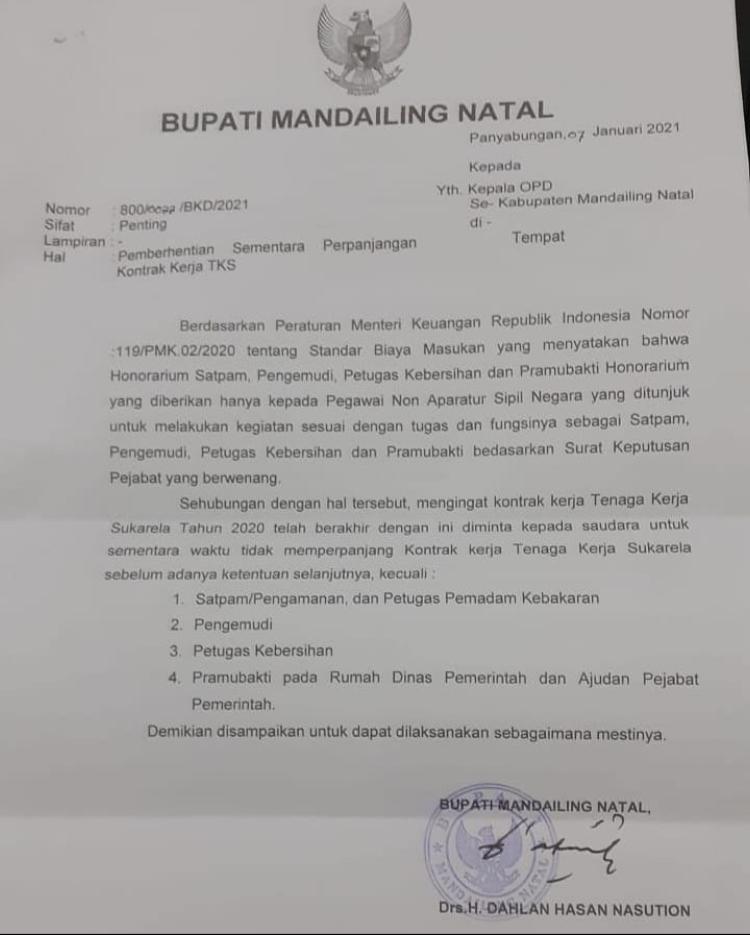 MANDAILING NATAL – Awal tahun 2021 beredar surat Bupati Mandailing Natal (Madina) Sumatera Utara (Sumut) yang berisi tentang hal pemberhentian sementara perpanjangan kontrak kerja TKS