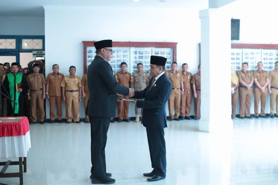MADINA- Bupati Mandailing Natal (Madina) HM Jafar Sukhairi Nasution resmi melantik Alamulhaq Daulay, SH sebagai penjabat Sekretaris Daerah (Sekda) di Aula Kantor Bupati, Desa Parbangunan, Kecamatan Panyabungan, Madina, Sumut, Senin (24/10/2022).