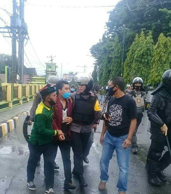 Terlihat dalam photo tersebut Kapolres bersama Ketua HIMMAH Cabang Padangsidimpuan Saut M Ritonga merangkul Mardin, empat personel Kepolisian dan dua orang mahasiswa dikabarkan terkena luka-luka pasca demo tolak Undang-undang Cipta Kerja didepan gedung DPRD Padangsidimpuan tersebut. (zn)