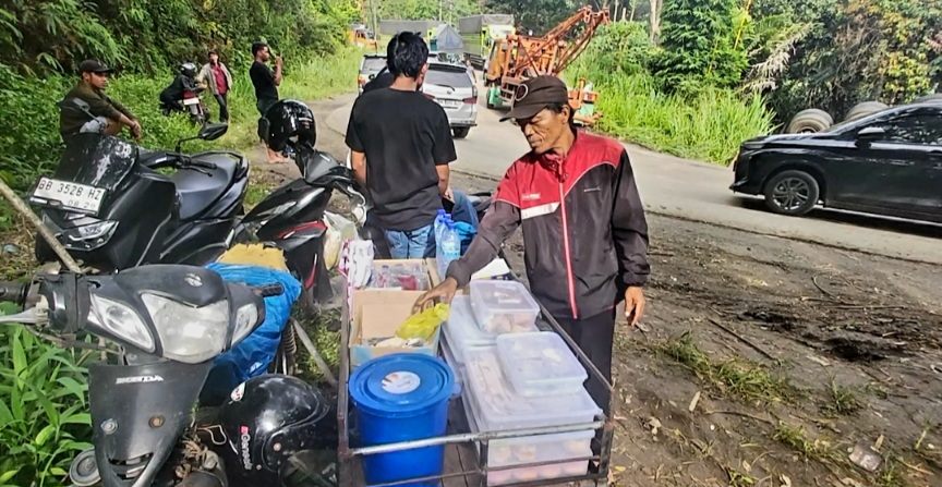 Aksi berjualan di lokasi kemacetan itu berawal saat satu unit mobil kontainer pengangkut pupuk terbalik di jalinsum tersebut. Akibatnya, ratusan kendaraan baik yang menuju maupun keluar Kota Padangsidimpuan terjebak macet.