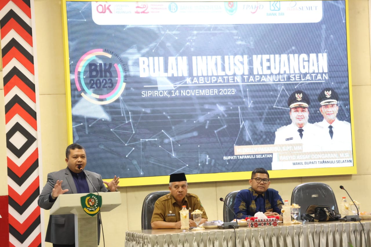 TAPSEL- Demi peningkatan kesejahteraan masyarakat, Pemerintah Kabupaten (Pemkab) Tapanuli Selatan (Tapsel) menyelenggarakan edukasi Bulan Inklusi Keuangan Tahun 2023 di Aula Sarasi Lantai III, Kantor Bupati Tapsel, Selasa (14/11).