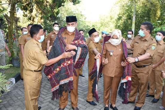 Saat baru tiba dihalaman kantor Bupati, Bupati dan Wakil Bupati Madina, langsung disambut oleh seluruh kepala OPD dan diberikan ulos sebelum memasuki gedung kantor Bupati Madina.