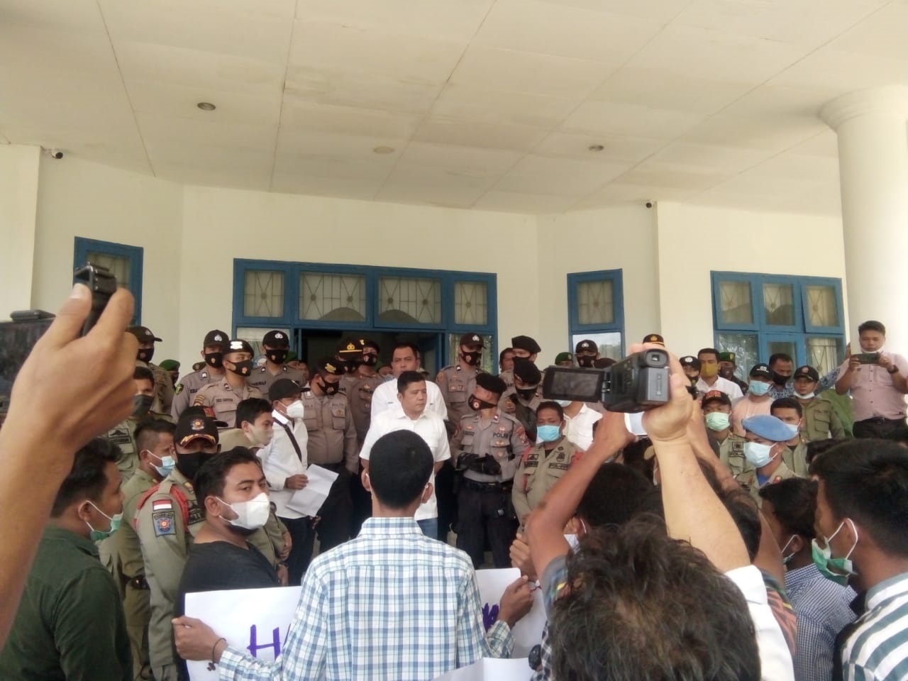 MANDAILING NATAL- Puluhan massa yang tergabung dalam Aliansi Perhimpunan Pemuda Madina Bersatu, melakukan aksi unjukrasa di kantor DPRD Kabupaten Mandailing Natal, Rabu (17/2/2021).