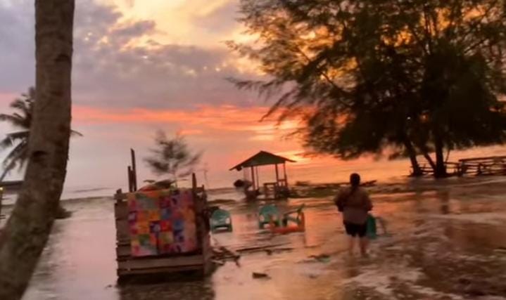 “Lokasi Rumah kami ini pun sudah tergenang air, bahkan pohon kelapa bertumbangan menimpa rumah warga. Tidak ada korban jiwa dalam peristiwa ini, kami sekarang sudah mengungsi menunggu angin dan ombak laut reda. Setelah itu kami akan kembali ke rumah,” katanya