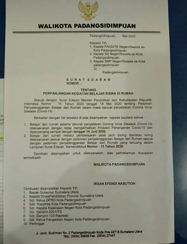 PADANGSIDIMPUAN-Jadwal belajar mandiri bagi siswa taman kanak-kanak (TK), sekolah dasar (SD), sekolah menengah pertama (SMP) dan sekolah menengah atas (SMA) di Padangsidimpuan diperpanjang hingga 14 Juni 2020.