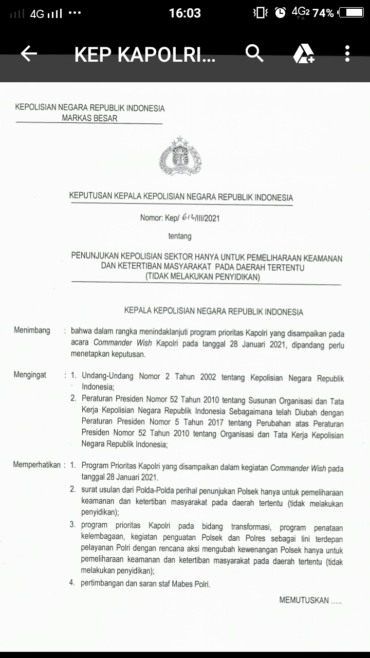 Hal itu tertuang dalam Keputusan Kapolri Nomor Kep/613/III/2021 tentang Penunjukan Kepolisian Sektor Hanya untuk Pemeliharaan Keamanan dan Ketertiban Masyarakat pada Daerah Tertentu (Tidak Melakukan Penyidikan). Keputusan ini adalah tindak lanjut program prioritas Jenderal Sigit yang disampaikan pada Commander Wish.