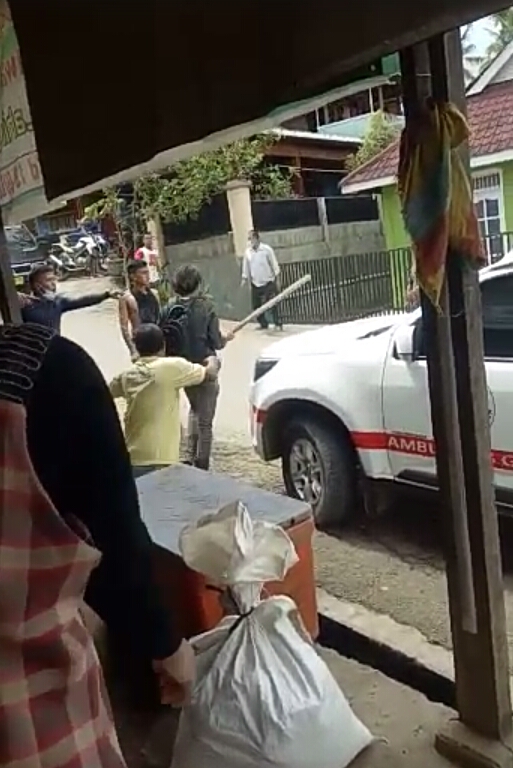 Mobil ambulan yang diturunkan ke lokasi kejadian untuk mengevakuasi warga korban keracunan, terlihat dihadang serta dipukuli dengan kayu oleh warga sekitar