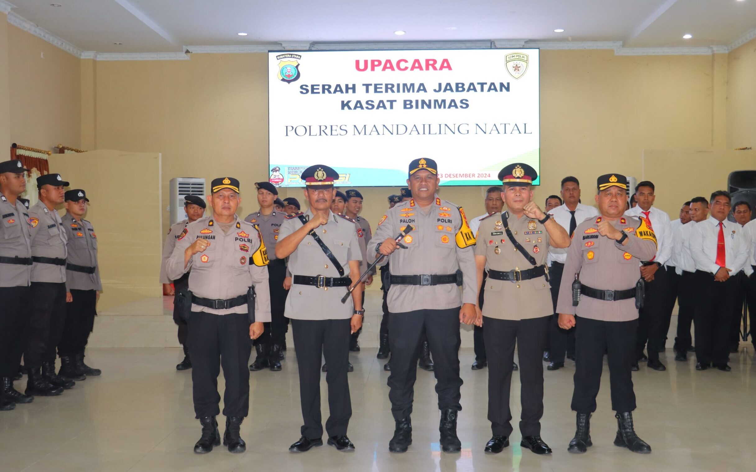 Kapolres Mandailing Natal (Madina) AKBP Arie Sofandi Paloh, S.H S.I.K memimpin upacara Serah Terima Jabatan (Sertijab) Kepala Satuan Pembinaan Masyarakat (Kasat Binmas) di aula Pesat Gatra Mapolres Madina, Senin (23/12/2024).