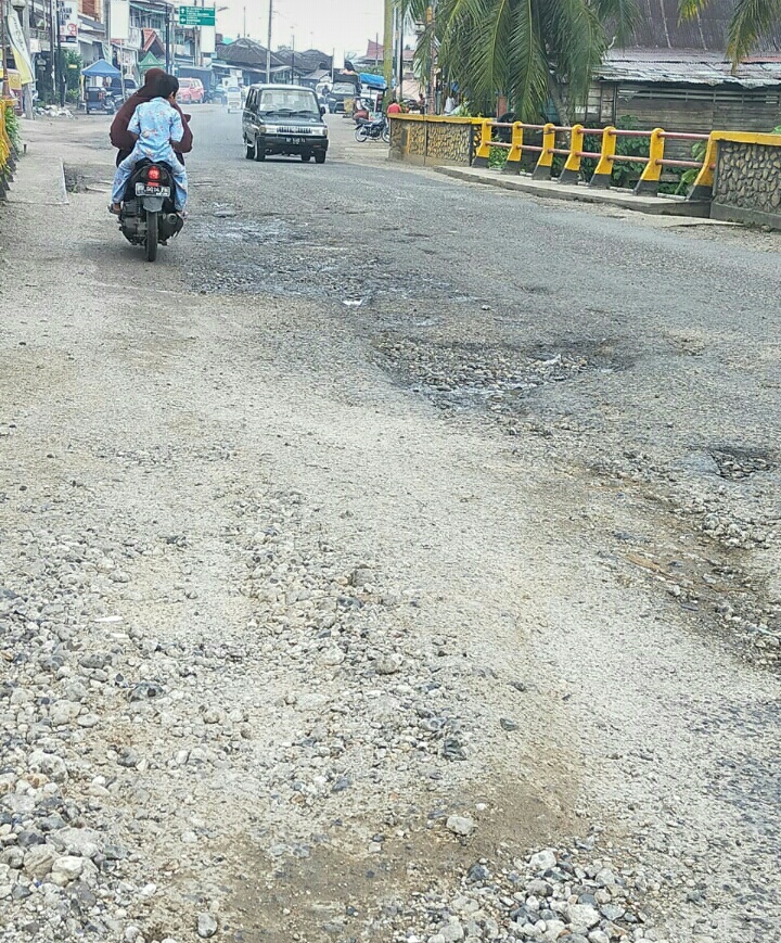 PADANGSIDIMPUAN-Kondisi ruas Jalan Lintas Sumatera, tepatnya di Jalan Jenderal Sudirman, Kelurahan Sigiring-giring , Kota Padangsidimpuan, Sumatera Utara sangat memprihatinkan. Pasalnya, kondisi ruas jalan yang hanya berjarak kurang lebih 1 kilometer dari pusat kota tersebut mengalami kerusakan parah.