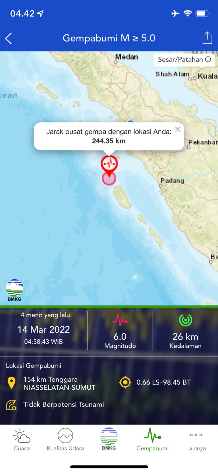 PADANGSIDIMPUAN-Gempa susulan terjadi di Nias Selatan, Sumatera Utara, dengan magnitude 6,0 kembali mengguncang Nias Selatan, Sumatera Utara, Senin (14/3/2022) pukul 04:38 WIB.
