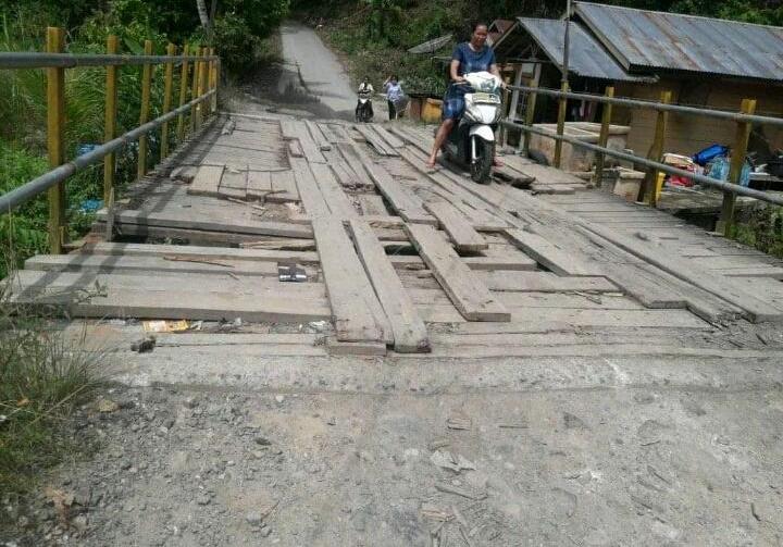 TAPANULI UTARA-Warga yang melintas dari jembatan penghubung (Janji Maria) di Desa Bonani Dolok, Kabupaten Tapanuli Utara, Sumatera Utara (Sumut) mengeluh. Pasalnya, badan jembatan mengalami kerusakan yang cukup parah.