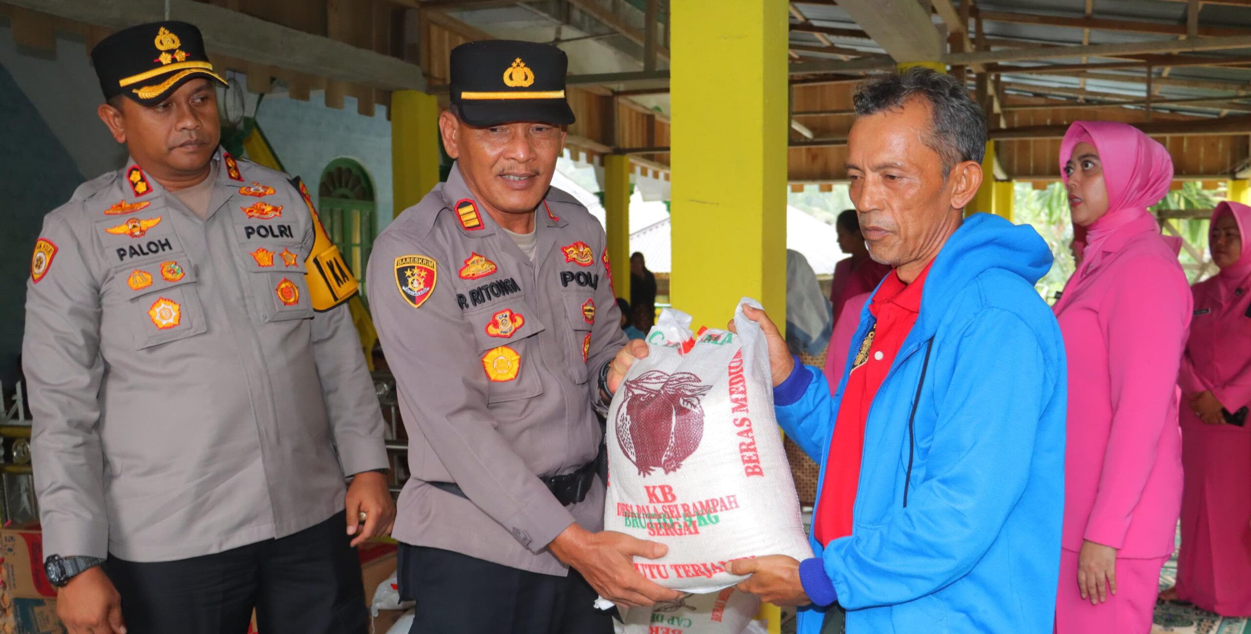 Kapolres Madina AKBP Arie Sofandi Paloh SH SIK didampingi Ketua Bhayangkari Cabang Madina Nyonya Yolanda Arie Sofandi Paloh beserta Pejabat Utama (PJU) dan Kapolsek Kotanopan AKP P. Ritonga menyerahkan langsung bantuan tersebut.