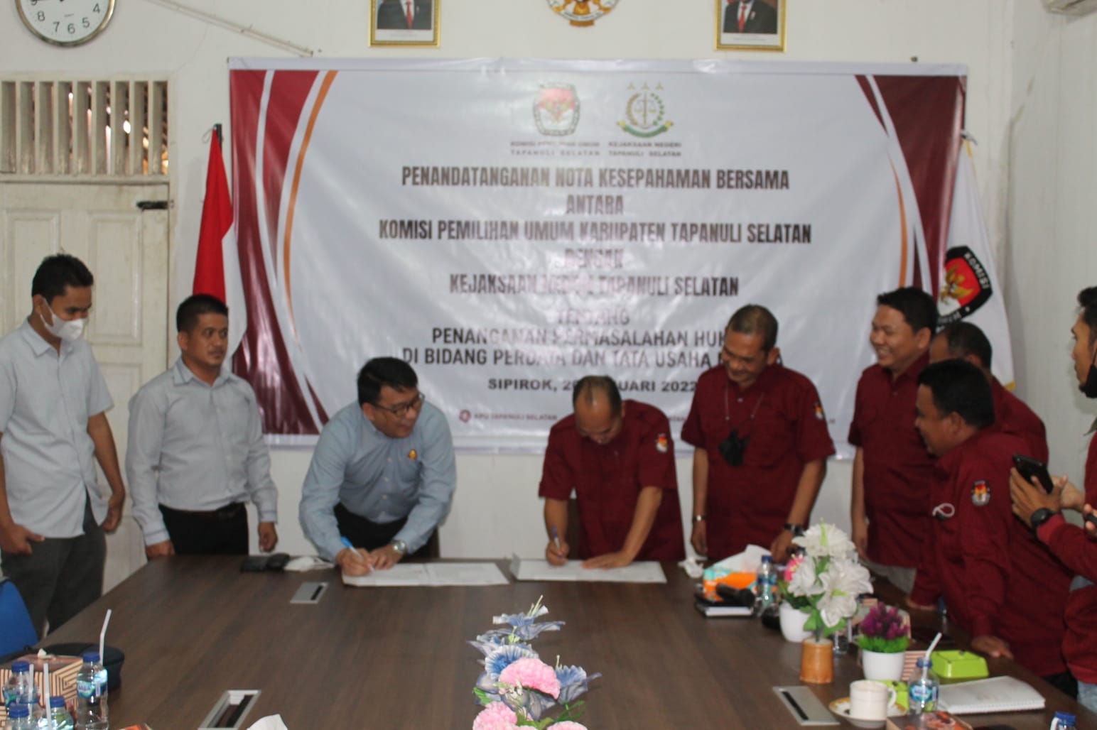 Nota kesepakatan atau “MoU” nomor 64/PR.07/1203/2022 – Nomor:B-55/L.2.35/Gs/01/2022 yang di tandatangani langsung antara Ketua KPU Panataran Simanjuntak M.Hum dan Kepala Kejaksaan Negeri (Kajari) Tapsel Antoni Setiawan SH, MH di laksanakan di Kantor KPU Tapsel, Kamis (20/1).