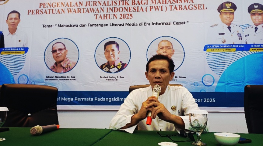 Ketua PWI Tabagsel H.Kodir Pohan S.Sos dalam sambutannya, kegiatan ini bertujuan memperkuat pemahaman mahasiswa mengenai dunia jurnalistik serta meningkatkan kemampuan mereka memilah informasi di tengah derasnya arus media digital.