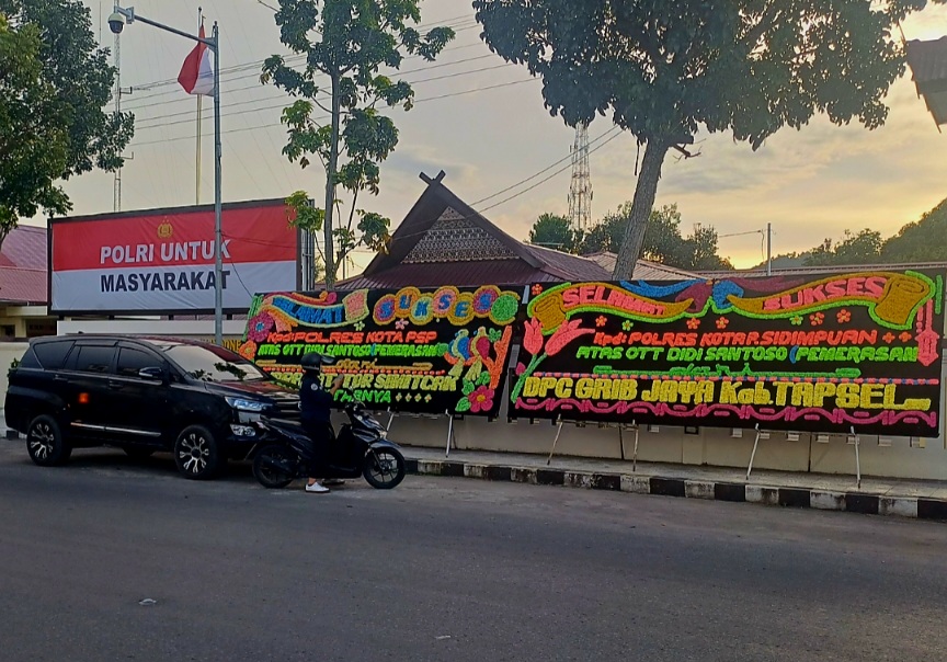 PADANGSIDIMPUAN-Pasca adanya oknum lembaga swadaya masyarakat (LSM) yang terjaring dalam operasi tangkap tangan (OTT), alaman Polres Padangsidimpuan, Polda Sumatera Utara (Sumut), dipenuhi papan bunga, Selasa (7/10).