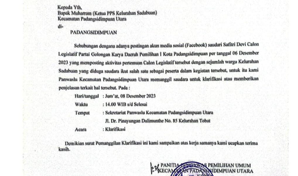 “Sehubungan dengan adanya postingan akun media sosial (Facebook) saudari Safitri Devi Calon Legislatif Partai Golongan Karya Daerah Pemilihan I Kota Padangsidimpuan per tanggal 06 Desember 2023 yang memposting aktivitas pertemuan Calon Legislatif tersebut dengan sejumlah warga Kelurahan Sadabuan yang diduga saudara ikut salah satu sebagai peserta dalam kegiatan tersebut, untuk itu kami Panwaslu Kecamatan Padangsidimpuan Utara memanggil saudara untuk klarifikasi atau memberikan penjelasan terkait hal tersebut,” bunyi surat panggilan yang berstempel Panitia Pengawas Pemilihan Umum berwarna biru.