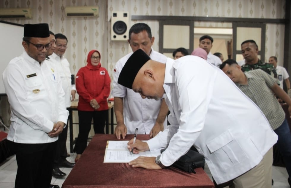 PADANGSIDIMPUAN – H Rusydi Nasution Ketua DPC Partai Gerakan Indonesia Raya (Gerindra) Kota Padangsidimpuan menandatangani kesepakatan pada deklarasi damai menjelang pemilu 2024.