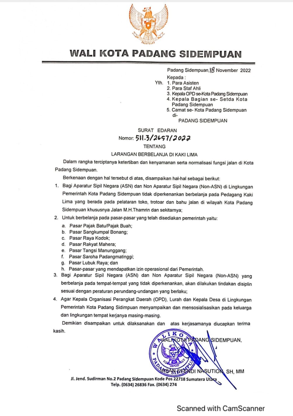 Diberitakan sebelumnya, Wali Kota Padangsidimpuan, Irsan Efendi Nasution menerbitkan surat edaran kepada masyarakat untuk tidak melakukan transaksi jual beli di badan jalan.