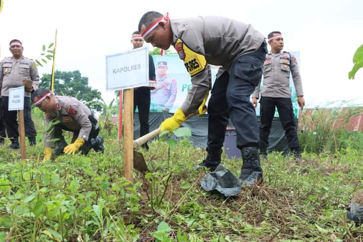 MANDAILING NATAL- Polres Mandailing Natal (Madina) Polda Sumatera Utara melaksanakan kegiatan menanam pohon serentak dalam rangka memperingati HUT Kemerdekaan Republik Indonesia ke-78 tahun 2023.