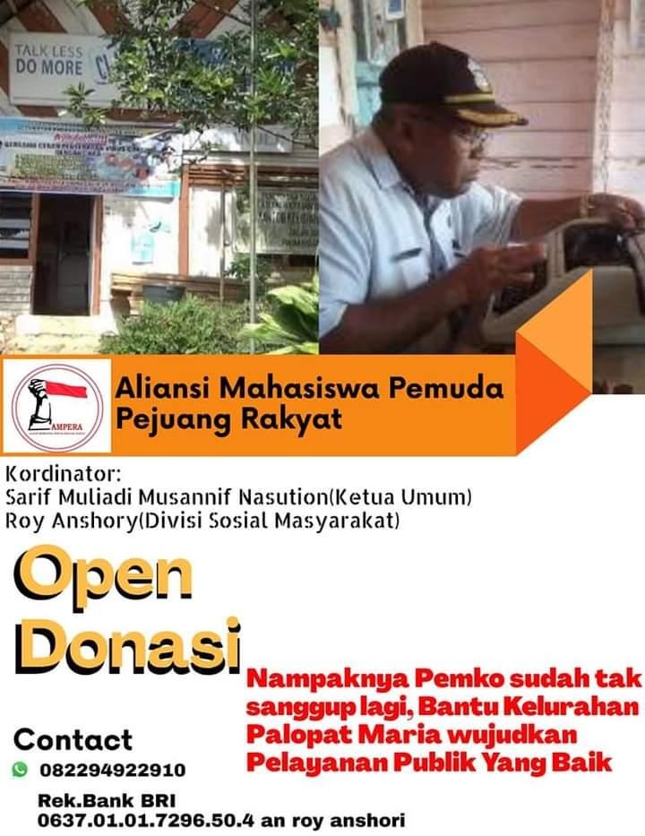PADANGSIDIMPUAN-Aliansi Mahasiswa Pemuda Pejuang Rakyat (AMPERA) akan melakukan aksi galang dana guna membantu pembangunan rehab kantor kelurahan di Palopat Maria, Kecamatan Hutaimbaru, Kota Padangsidimpuan, Sumut.