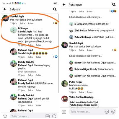 “Jangan percaya dengan berita ini, ini berita hoax” tulis akun Kenzo Auzora Dasopang. Selanjutnya, Akun Sendal Jepit juga berkomentar, “pas mai, berita b**k b**k do on” dalam bahasa Indonesia yang artinya, betul itu, ini berita bohong yang gak benar adanya.