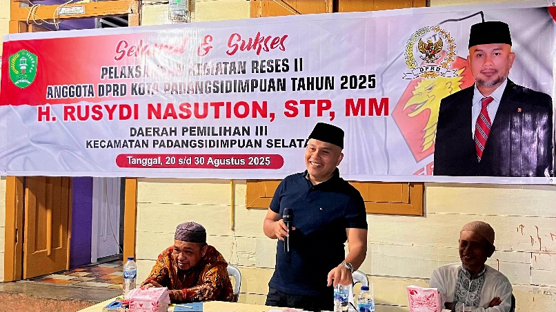 PADANGSIDIMPUAN-Pimpinan DPRD Padangsidimpuan, Rusydi Nasution menggelar reses di Siborang, tepatnya di Gang Budiman, Kecamatan Padangsidimpuan Selatan, Kota Padangsidimpuan.