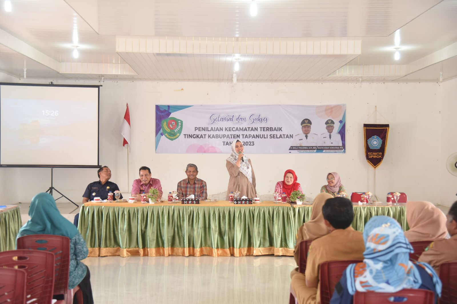 TAPSEL- Ketua Tim Penggerak (TP) Pemberdayaan dan Kesejahteraan Keluarga (PKK) Kabupaten Tapanuli Selatan (Tapsel), Ny Rosalina Dolly Pasaribu, melakukan peninjauan ke Kecamatan Sipirok, dalam rangka penilaian kecamatan terbaik tingkat Kabupaten Tapsel, di Aula Kantor Camat setempat, Jumat (11/8/2023).