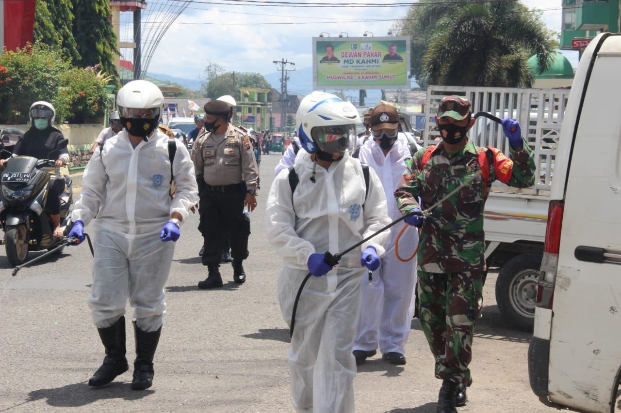 PADANGSIDIMPUAN-TNI-Polri terus mengajak masyarakat di Kota Padangsidimpuan, Sumatera Utara (Sumu), untuk berperang melawan COVID-19. Namun, perang tersebut bukan mengangkat senjata, melainkan melakukan penyemprotan cairan disentektan dan tetap menjaga protokol kesehatan (prokes).